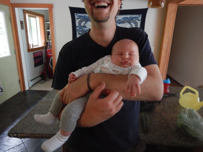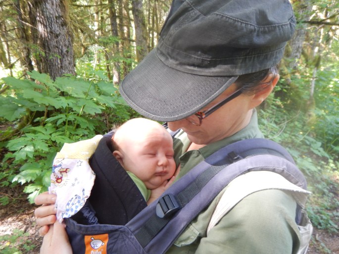 A carrier ride on the bright-green Treadwell trail with a visiting Aunt Myrrhia…